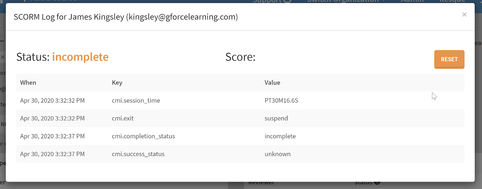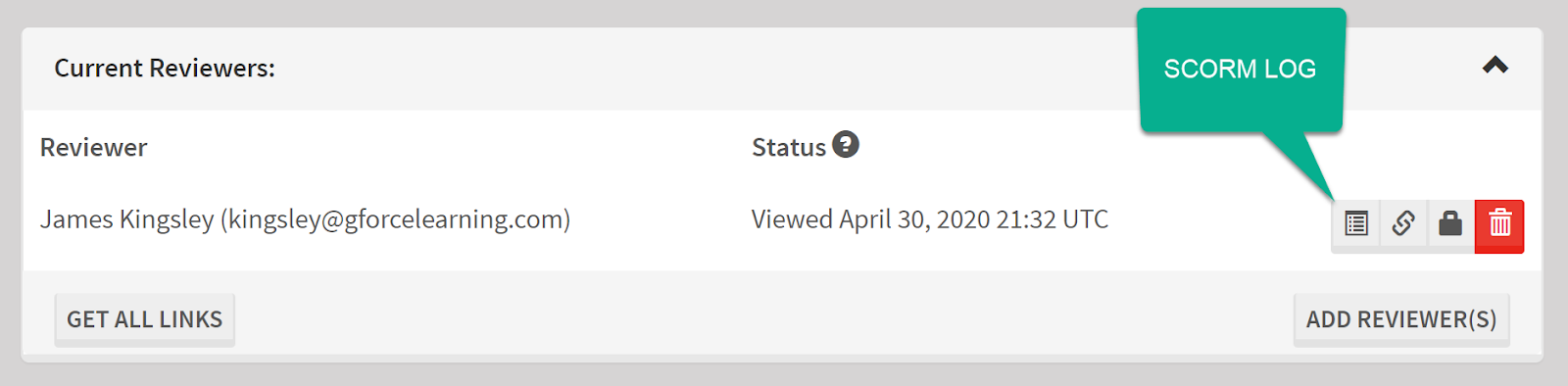 - Click the button and that Reviewer’s SCORM log will popup.